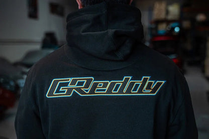 Color: Black pullover hoodie with GReddy G logo, front left chest and GReddy logo back